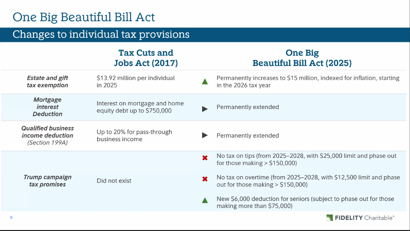Here are some tax planning ideas that high net worth individuals should consider in light of the Big Beautiful Bill’s passing. Before you read on, please remember that we are not CPAs; for tax advice specific to your personal situation, consult with your tax or financial advisor.